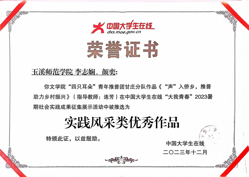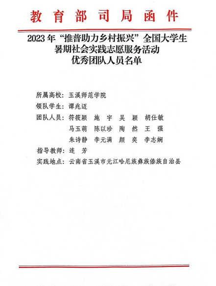 玉溪师范学院文学院赴玉溪市元江哈尼族彝族傣族自治县甘庄街道“四只耳朵”青年推普团在2023年“推普助力乡村振兴”全国大学生暑期志愿服务活动中表现出色,成果显著,喜获教育部语言文字应用管理司和团中央青年发展部的来信表扬。