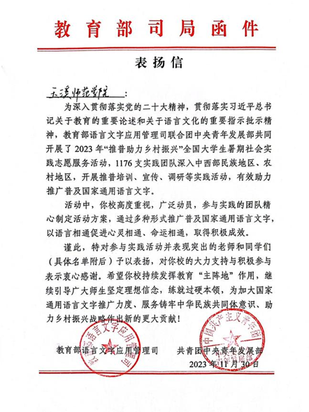 信中对玉溪师范学院文学院“四只耳朵”青年推普团赴元江甘庄的工作成果给予了肯定,同时,教育部语言文字应用管理司和团中央青年发展部希望我校能持续发展教育“主阵地”作用,继续引导广大师生坚定理想信念,练就过硬本领,为加大国家通用语言文字推广力度、服务铸牢中华民族共同体意识、助力乡村振兴战略作出更大贡献。