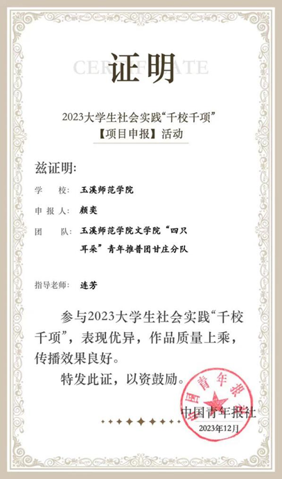 玉溪师范学院文学院赴玉溪市元江哈尼族彝族傣族自治县甘庄街道“四只耳朵”青年推普团由玉溪师范学院文学院团委书记连芳老师指导,谭兆迈、符筱颖、施宇、吴颖、胡仕敏、马玉萌、陈以珍、陶然、王强、朱诗静、李元满、颜奕、李志娴13位成员组成。实践团深入玉溪市元江哈尼族彝族傣族自治县甘庄街道进行调研,于2023年7月17日至23日开展了为期7天的“八个一”推普小课堂和面向少数民族母亲的“妈妈普通话”线上培训课程。活动中,实践团帮助当地村民与小朋友们了解普通话与讲好普通话的重要意义,以“果园推普”、“直播助农”、“实地调研”等多元形式将普通话带进田间地头,在实践地创设了学习、练习普通话的语言环境,以青年人的干劲与热情为甘庄普通话推广工作贡献青春力量。