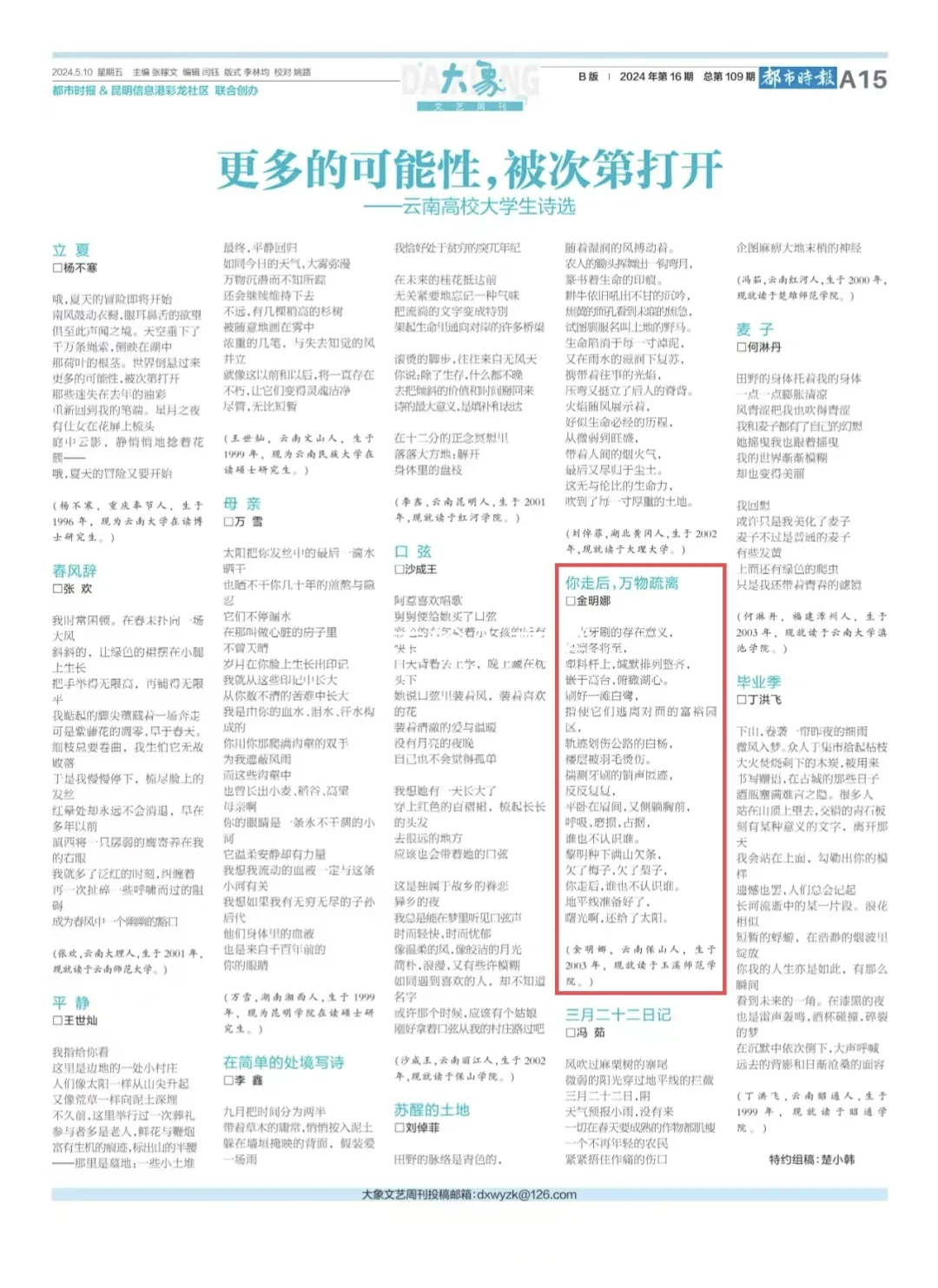 祝贺文学院中文本科21-1金明娜同学的诗歌《你走后,万物疏离》入选《都市时报》:《更多的可能性,被次第打开——云南高校大学生诗选》。