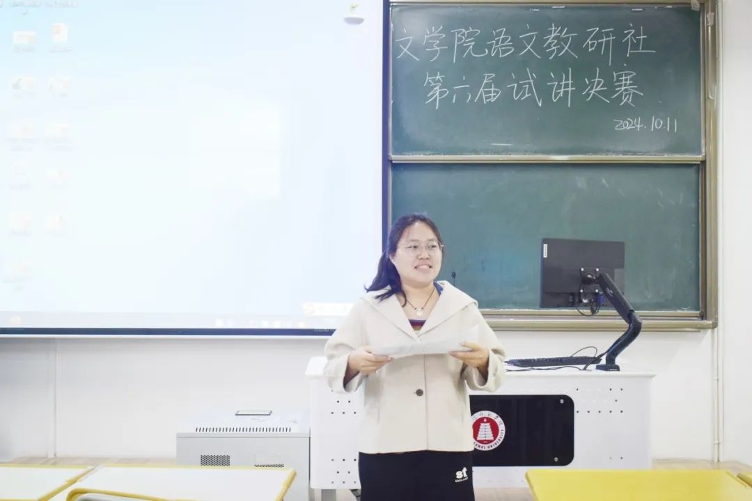 2024年10月11日14:10,文学院“语文教研社”第六届试讲比赛决赛在13教学楼406教室成功举办。本次比赛由社团指导教师赵江云主持,以部编本中学语文课文中的经典篇目为主题,吸引了众多热爱语文教学的同学们积极参与。经过激烈的预赛选拔,共有10位选手脱颖而出,晋级决赛。