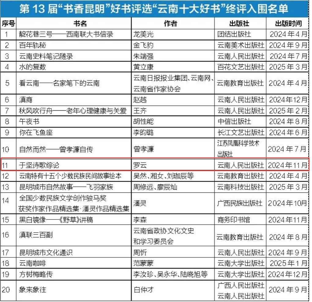 玉溪师范学院文学院罗云博士学术专著《于坚诗歌综论》入围第13届“书香昆明”好书评选“云南十大好书奖”前20强