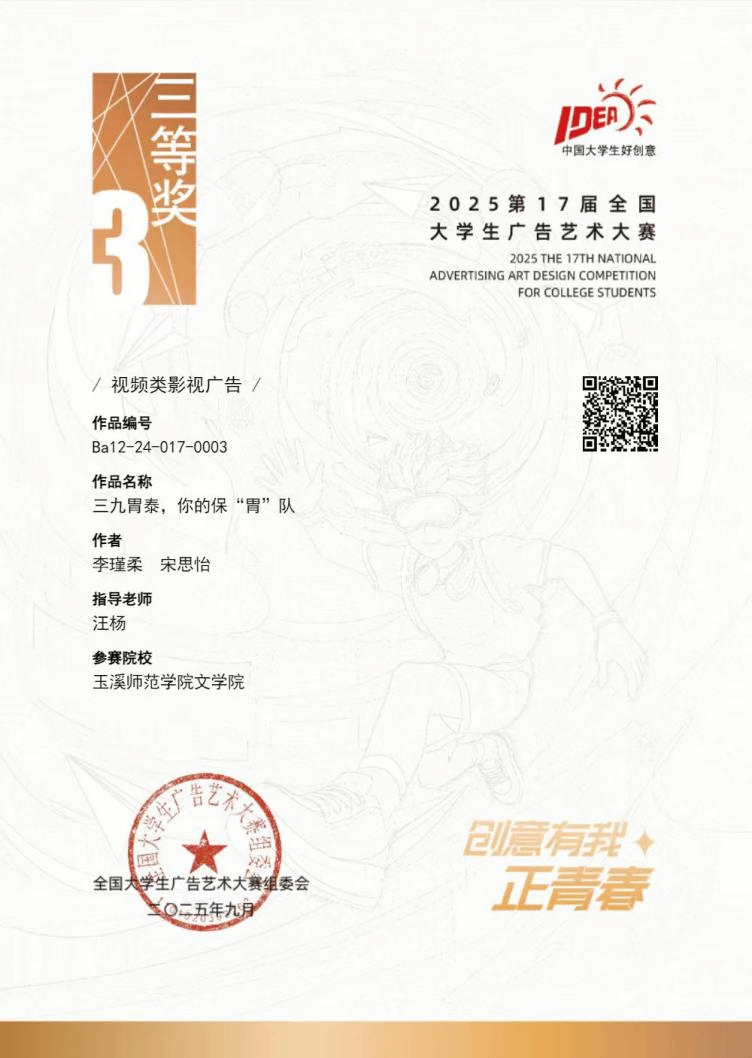 近日,第十七届全国大学生广告艺术大赛(简称“大广赛”)全国总评审结果揭晓。本届大赛共吸引全国1897所高校的近158万名师生参与,报送作品总量突破58万组,竞争异常激烈。玉溪师范学院文学院汪杨老师指导的新闻学专业学子在比赛中表现突出,共斩获国家级三等奖1项、省级三等奖1项、省级优秀奖4项,展现出扎实的专业素养与创新能力。