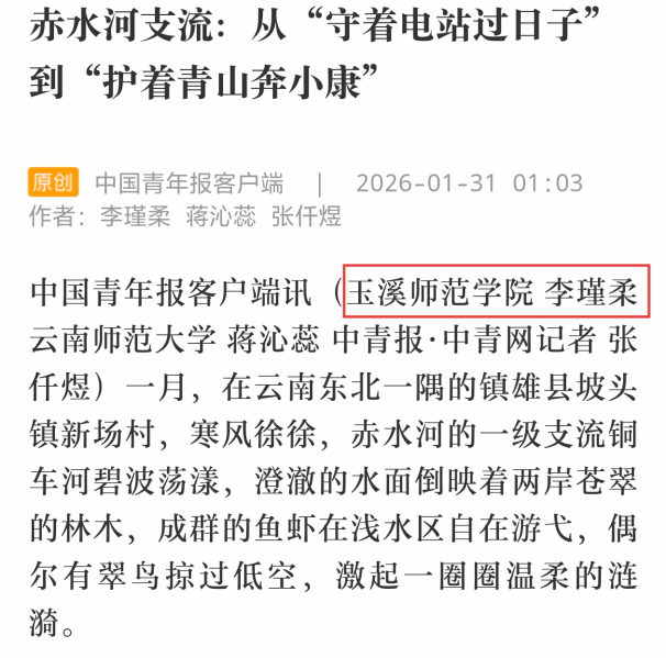 据了解,本次“青年眼中的家乡河·幸福河”第二季活动在云南省范围内共遴选5名高校学生参与报道实践,入选高校包括云南大学、云南师范大学、云南艺术学院和玉溪师范学院。玉溪师范学院是其中唯一入选的地方本科高校。此次入选,既体现了学生扎实的专业能力,也展现了学校新闻学专业应用型人才培养的实际成效。
