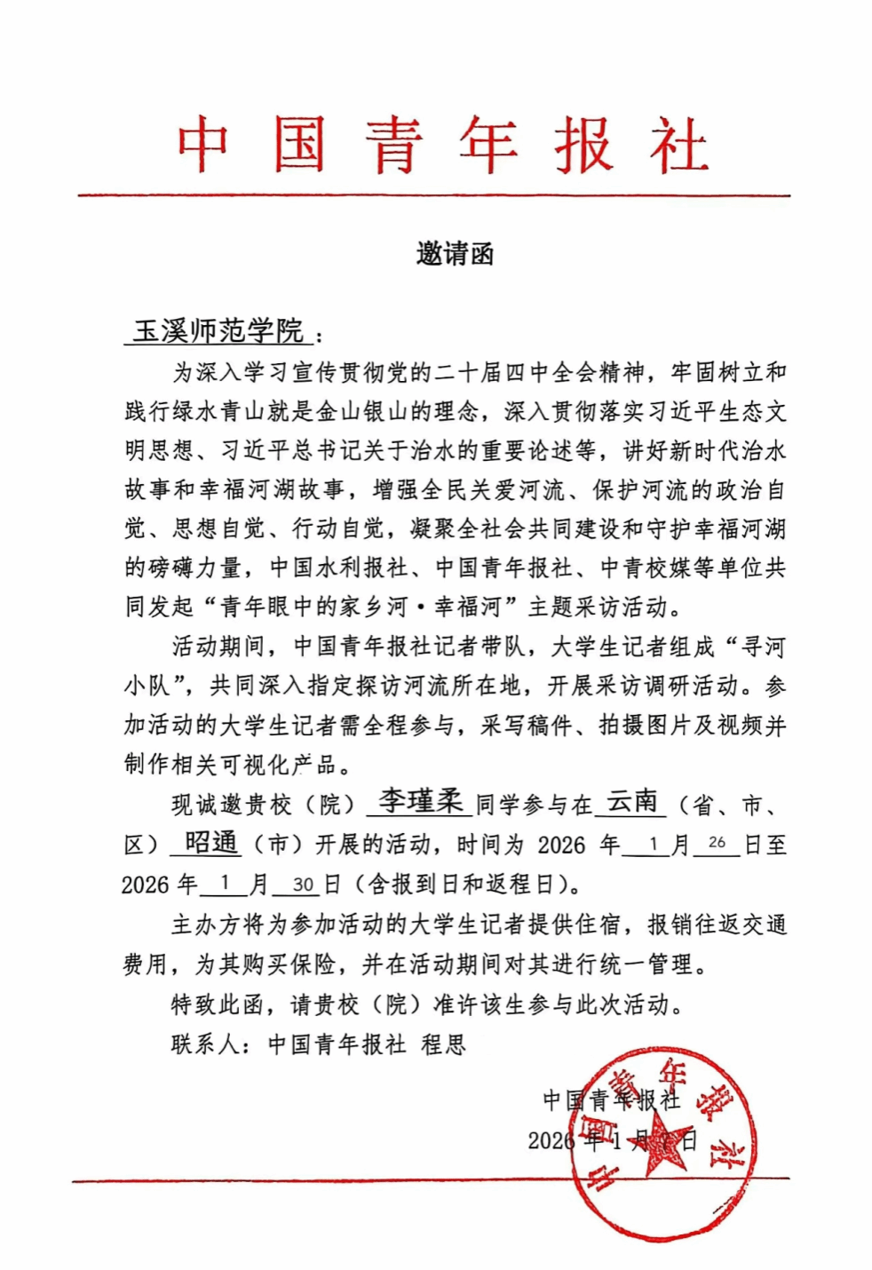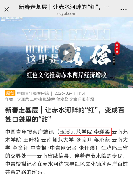 近日,由水利部指导,中国水利报社、中国青年报社联合主办,中青校媒承办的“青年眼中的家乡河·幸福河”第二季活动圆满结束。玉溪师范学院文学院新闻学专业2023级学生李瑾柔经过自愿报名、材料审核和层层选拔,成功入选中青校媒云南昭通寻河小队,赴镇雄、威信两县沿赤水河开展实地采访与报道撰写。