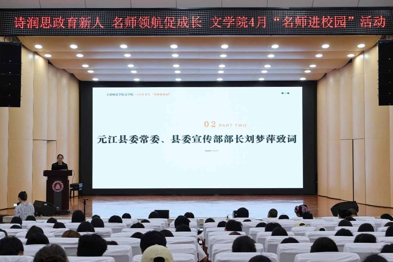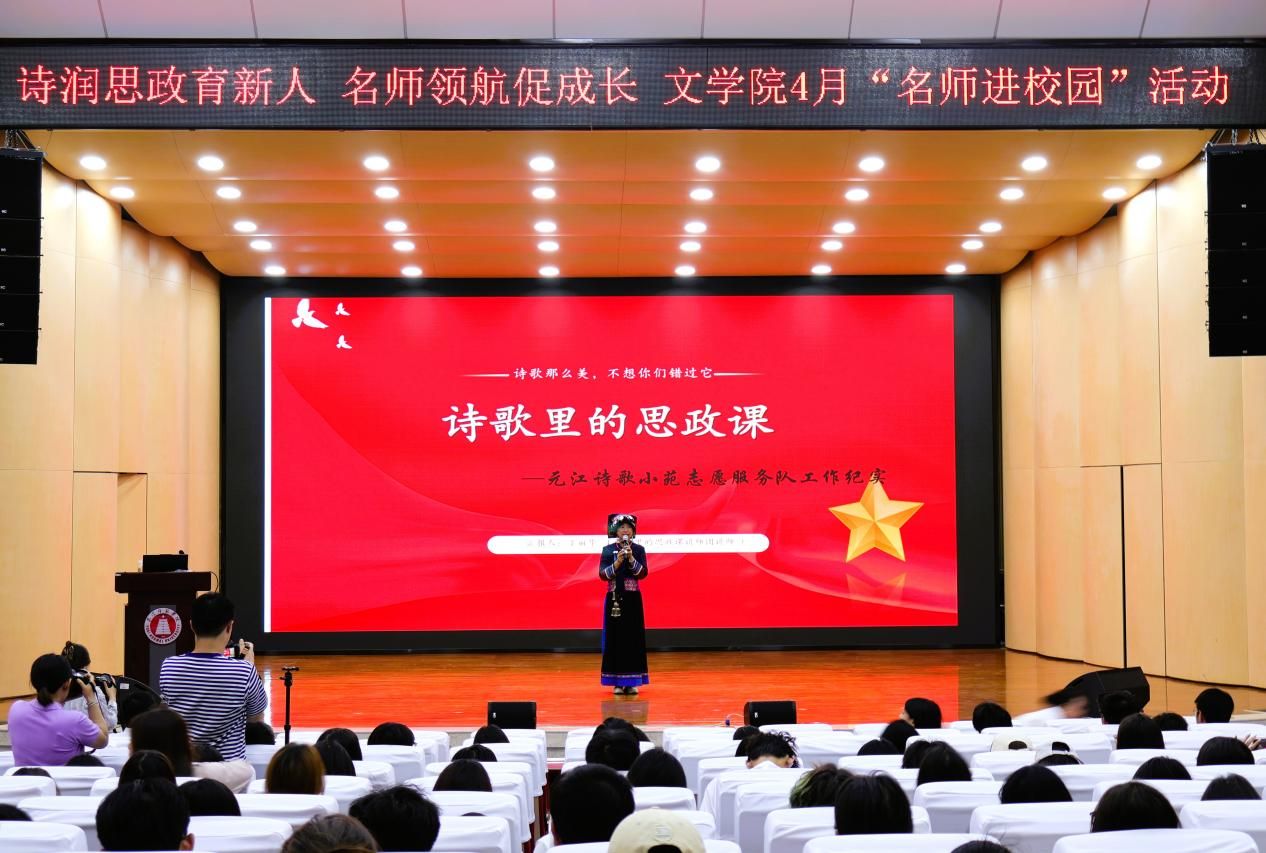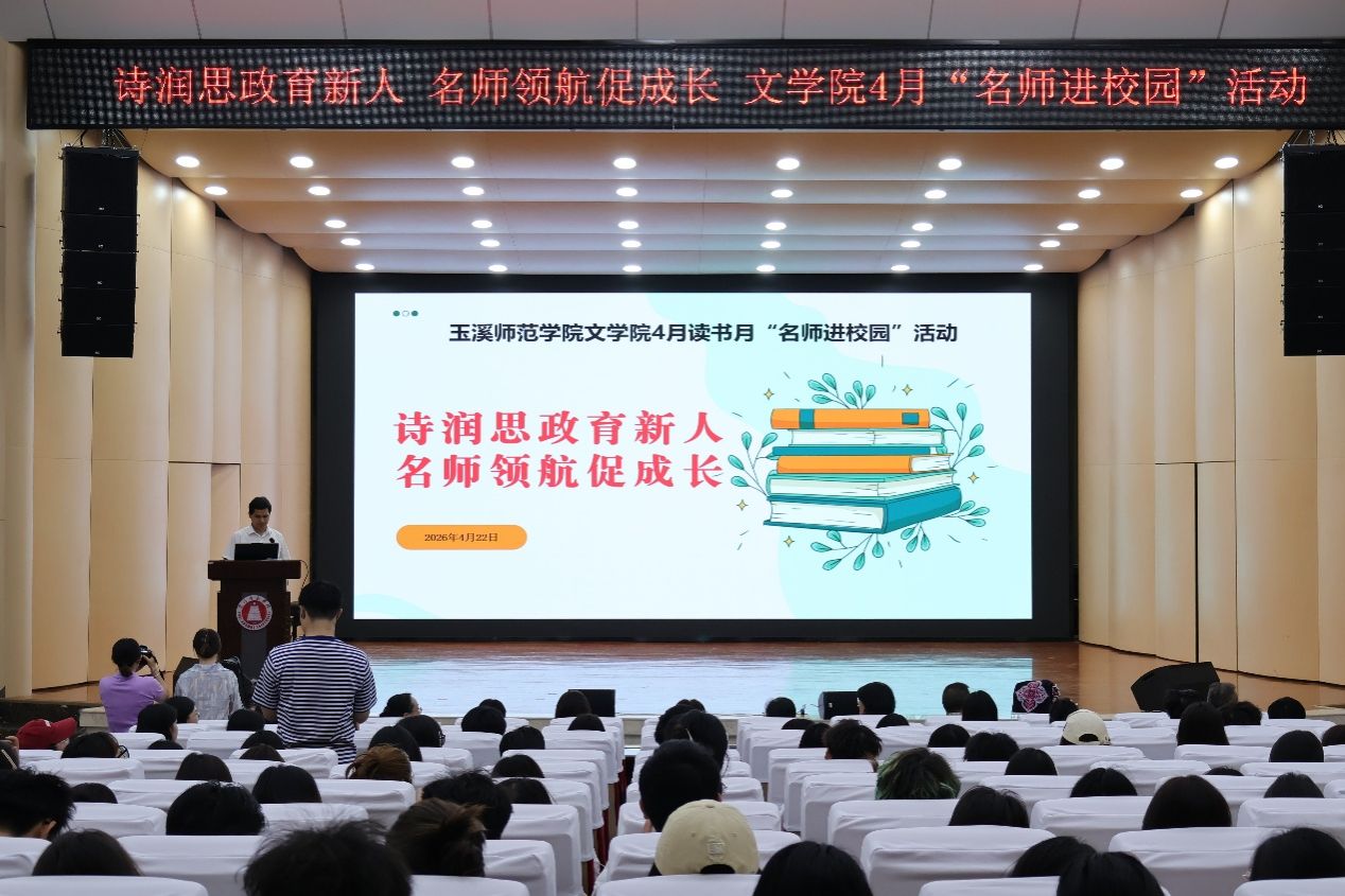 4月22日,玉溪师范学院文学院以“诗润思政育新人,名师领航促成长”为主题的读书月“名师进校园”活动在聂耳演艺厅顺利举行。本次活动深化校地协同,玉溪师范学院与元江县携手共建、合力打造“诗歌里的思政课”,推动文学教育与思政育人深度融合。