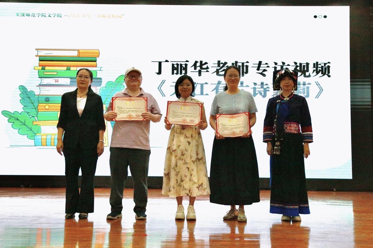 玉溪师范学院文学院为元江县文联作家协会主席、元江诗歌小苑志愿服务队发起人丁丽华颁发“驻校诗人”聘书,元江县领导为文学院教师颁发元江县“诗歌里的思政课”志愿讲师团聘书,正式构建校地协同思政育人队伍,合力打造“诗歌里的思政课”思政工作品牌。