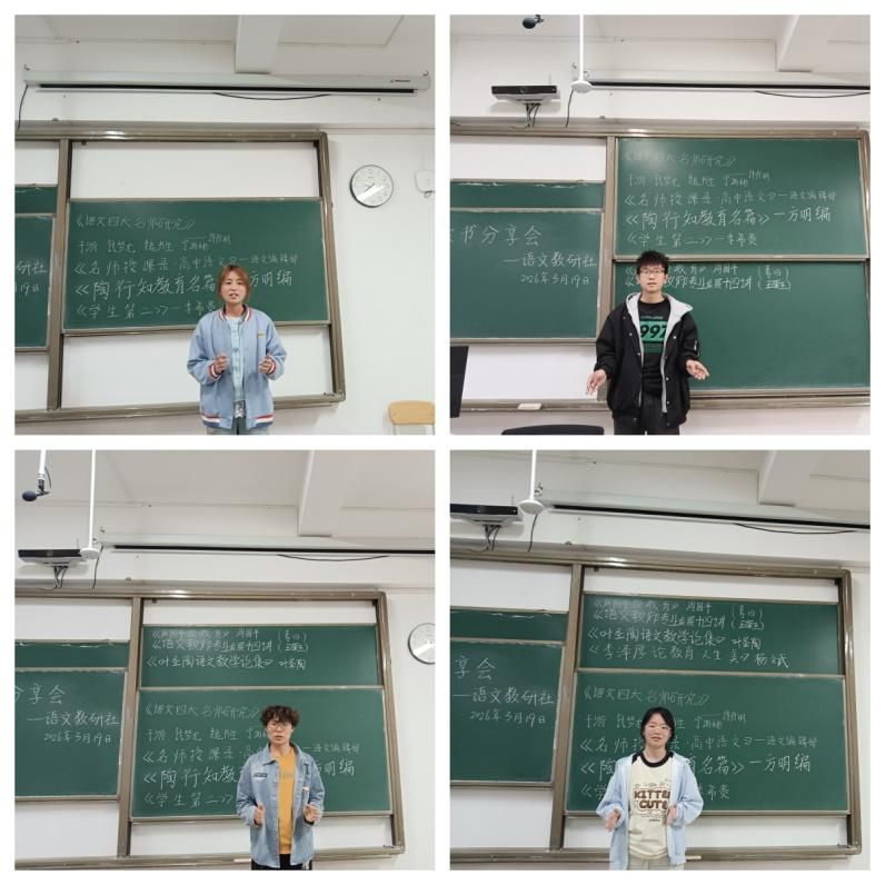 分享现场,社员们结合自身学习与师范实践,从不同视角解读教育经典:有的从周国平“教育即生长”的理念出发,探讨语文教育对学生生命成长的滋养;有的围绕王荣生、叶圣陶等前辈的教学思想,剖析语文课堂的本质与核心素养培育路径;还有的重点分享《语文四大名师研究》中于漪、钱梦龙、魏书生、宁鸿彬四位名师的教学智慧;有的结合《名师授课录》中的案例,探讨如何将名师经验转化为自身教学实践能力。此外,《陶行知教育名篇》里的生活教育思想、《学生第二》中以生为本的管理理念,也成为大家热议的话题,引发了对“教育者角色”“课堂师生关系”的深入思考。